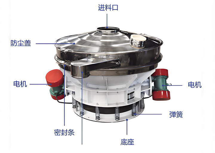 常见直排筛型号由电机、防尘盖、进料口等部件组成,其中电机可以选择单电机或双电机,设备也可以在原有部件中加入相关配件,如在直排筛上盖加观察口,便于实时监控筛分过程和物料状态;加高支腿可以方便出料口连接料桶或小车;加装超声波电源及换能器,能有效解决高静电、易团聚等难筛分物料的堵网问题;在医药、食品行业,常需在上盖加磁棒,以吸附原料中可能存在的微量铁磁性杂质,确保产品纯度。