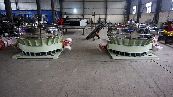 上图为山东的一位客户购买的两台直径1800mm的单层不锈钢直排筛,用来对面粉里面的包装绳碎屑除杂。这两台机器被放在自动化的联动生产线上,是面粉成品包装的前端环节。面粉进入筛框,通过筛分除杂的纯净面粉从出料口排出,输送到自动称重包装机那里,分为10kg/袋或25kg/袋。两台机器每小时一共能处理50吨左右的面粉,处理量很大。